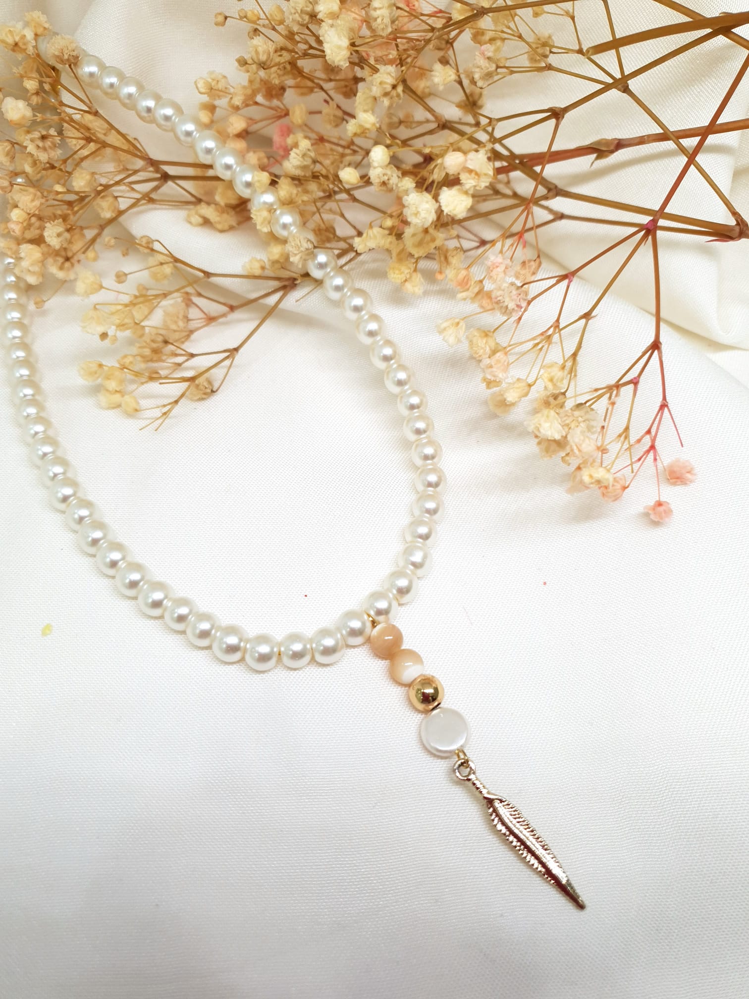 השרשרת הזו מביאה עימה עיצוב מעודן ואלגנטי שמפיץ תחושת יוקרה וקסם. החלק המרכזי של השרשרת מורכב מחרוזים דמויי פנינה, שמעניקים לתכשיט מראה קלאסי ורך, עם ברק נעים ומרגיע. בקצה השרשרת תלוי תליון בצורת נוצה זהב, בעיצוב מהודר ומוקפד, שמוסיף שיק מודרני. הנוצה הזהובה, עם הקווים המדויקים שלה, יוצרת קונטרסט מושלם עם הפנינים ומשלימה את המראה הכללי של התכשיט. השילוב של דמוי הפנינה עם התליון הזהוב יוצר שרשרת שמשדרת אלגנטיות מוחלטת