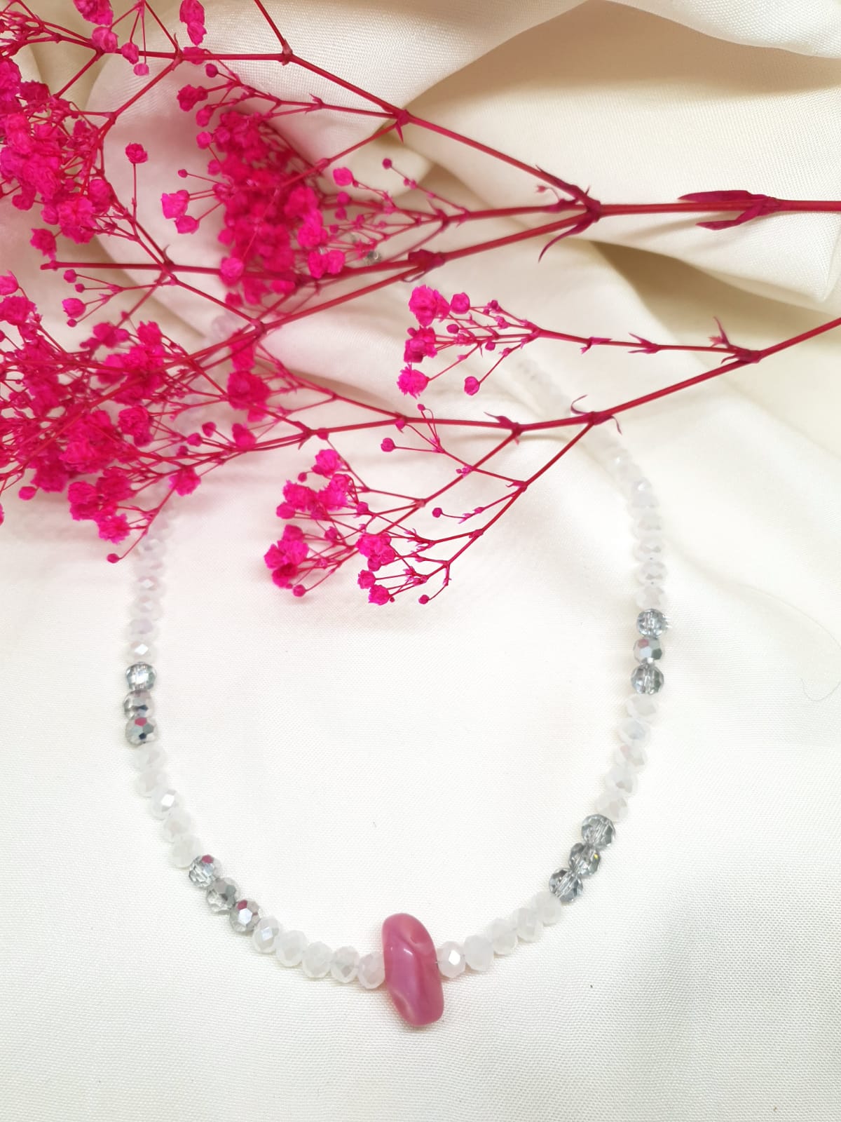 השרשרת הזו היא תכשיט שמפיץ זוהר עדין ומרשים, עם עיצוב שמשלב בין ניקיון לאלגנטיות. הקריסטל הלבן והכסוף שבמרכז השרשרת מעניק מראה מודרני ומלא ברק, כאשר התגמול של הקריסטלים היוקרתיים משלים את האפקט הנפלא. בקצה השרשרת תלוי תליון אבן סברובסקי ובצבע בורדו עם הברק המיוחד שלה, מדגישה את השילוב החי והקלאסי של הצבעים הלבנים והכסופים ויוצרת מראה ייחודי ומושך. השרשרת מתאימה לכל הזדמנות, מספקת את האלגנטיות ומשלימה כל הופעה בצורה מושלמת