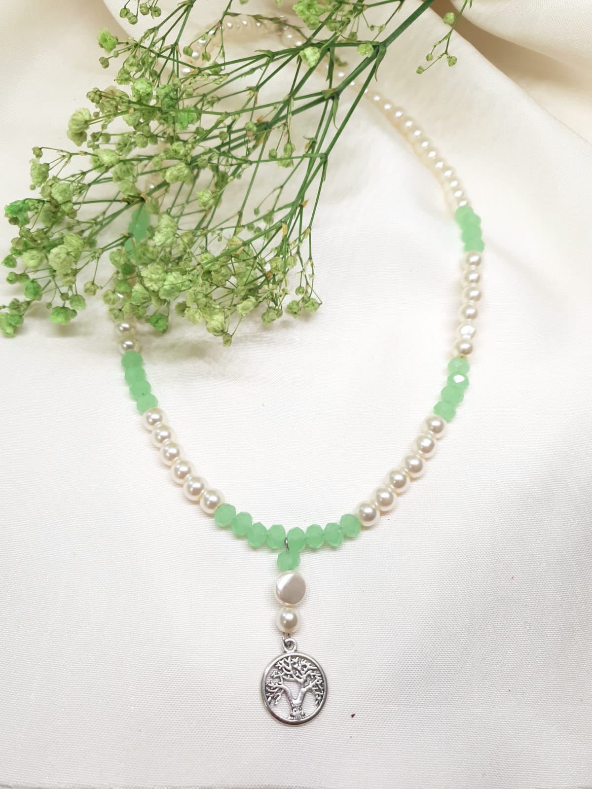 השרשרת הזו מציעה שילוב מושלם של אלגנטיות ותחושת טבע עם עיצוב ייחודי ומרשים. הקריסטל הירוק הבהיר שבמרכז השרשרת משדר זוהר עדין, ומבצע את התפקיד של גורם משיכה עוצר נשימה. חרוזי הדמוי פנינה שמקיפים את הקריסטל מביאים נופך של יוקרה ורכות, תוך שהם מוסיפים מגע של קלאסיות ותשומת לב לפרטים. בקצה השרשרת נמצא תליון עץ החיים, המגלם את הקשר בין האדמה לשמיים ומעניק לתכשיט נפח רוחני ותחושת הרמוניה. השילוב של הקריסטל הירוק, חרוזי הפנינה ותליון עץ החיים יוצר תכשיט מרהיב שמשלב בין אופנתיות לשיק רוחני, ומתאים לכל הופעה שמחפשת לזרוח ולהיות ייחודית
