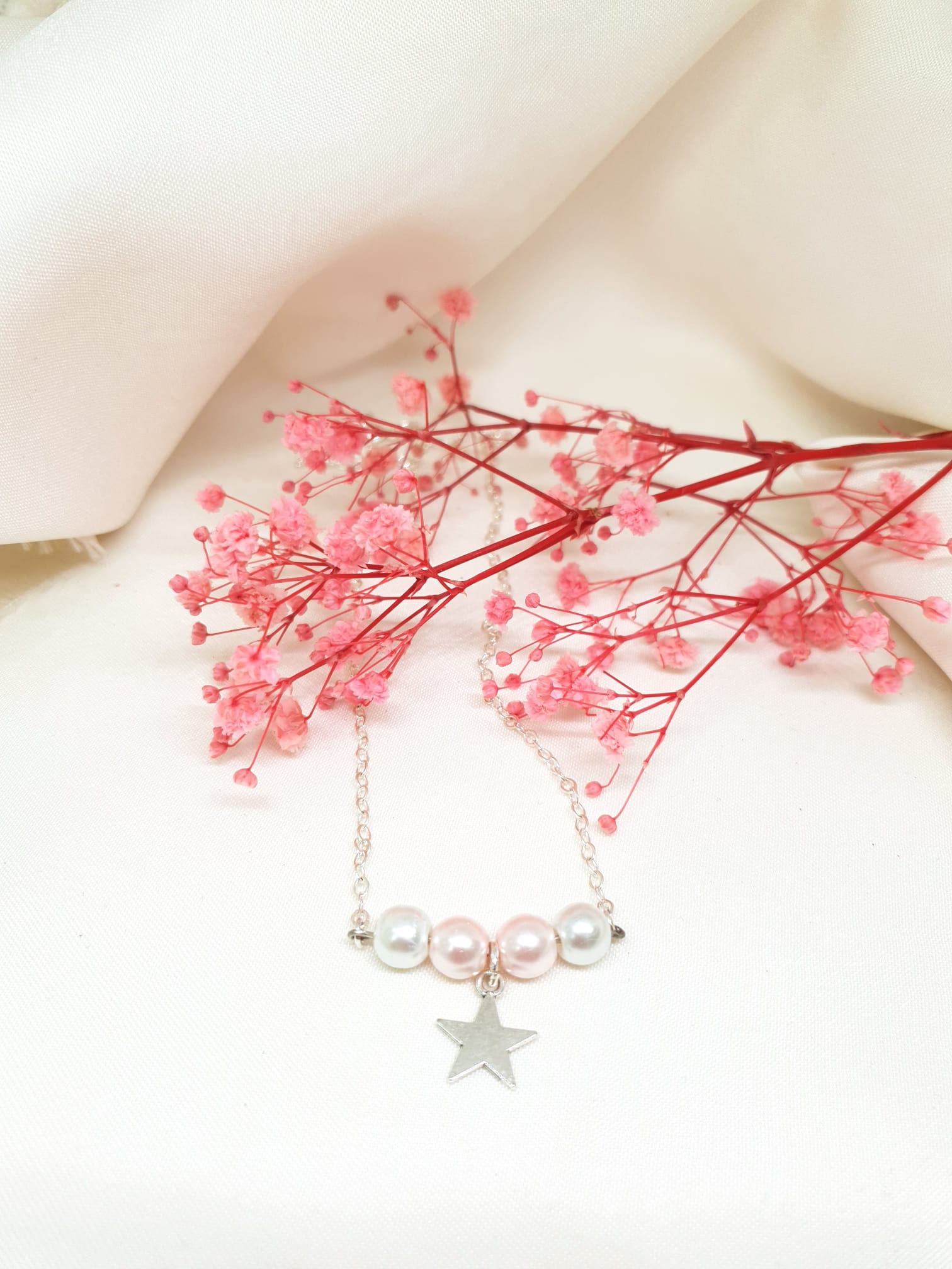 שרשרת עדינה ומרהיבה זו משלבת בין אלגנטיות לנגיעות של רומנטיקה. השרשרת עשויה מציפוי כסף, כשבמרכזה חרוזי דמוי פנינה , יחד עם חרוז ורוד עדין, המשדרים תחושת רכות ונשיות. תליון כוכב כסוף נוסף מוסיף נגיעה של קסם , ומשלים את המראה החינני של השרשרת. עיצוב זה, בשילוב הצבעים הרכים והכוכב הנוצץ, מעניק תחושת שלווה וחלום, והופך את השרשרת לאביזר מושלם להשלמת כל הופעה, בין אם לאירוע מיוחד או לשימוש יומיומי