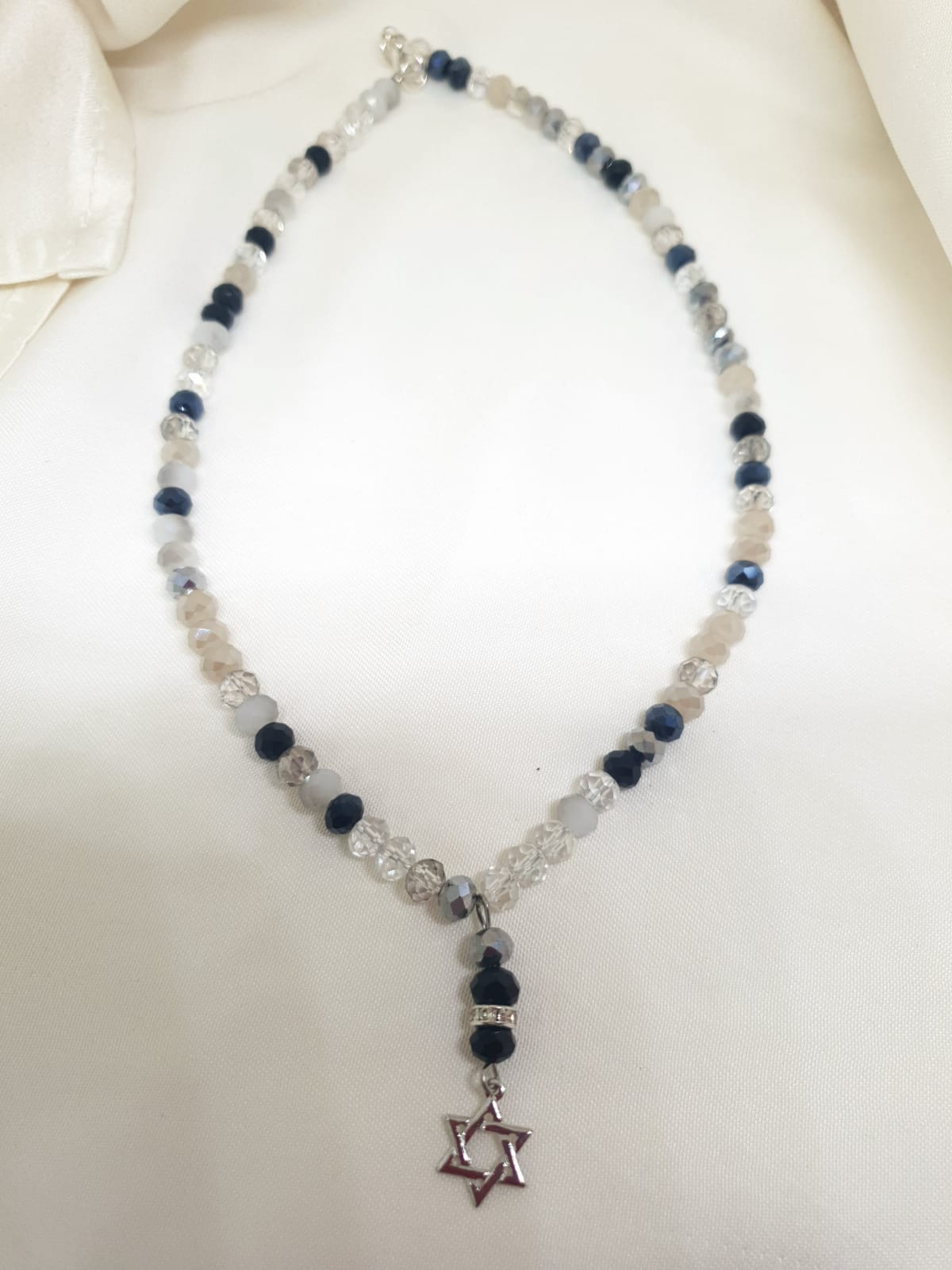 השרשרת הזו משלבת בצורה מושלמת בין צבעים וניצוצות עם עיצוב שמעניק תחושת שיק וייחודיות. הקריסטלים השחורים, הלבנים והשקופים, המשתלבים יחד בצורה הרמונית, מפזרים אור ויצירתיות, עם נצנוץ שמוסיף עומק ויופי לכל הופעה. השילוב של הקריסטלים יוצר אפקט של ברק ורכות, והם מהווים את התפאורה המושלמת לתליון מגן דוד שבקצה השרשרת. התליון, בעיצובו המדויק והאיכותי, מקנה לתכשיט נופך של סמליות ותחושת קשר למסורת ולתרבות. השילוב בין הקריסטלים הנוצצים לתליון המגן דוד יוצר תכשיט שמביא עימו נגיעה של זוהר אישי ומשמעות רוחנית, ומעניק לכל הופעה תחושת אלגנטיות וחיבור עמוק