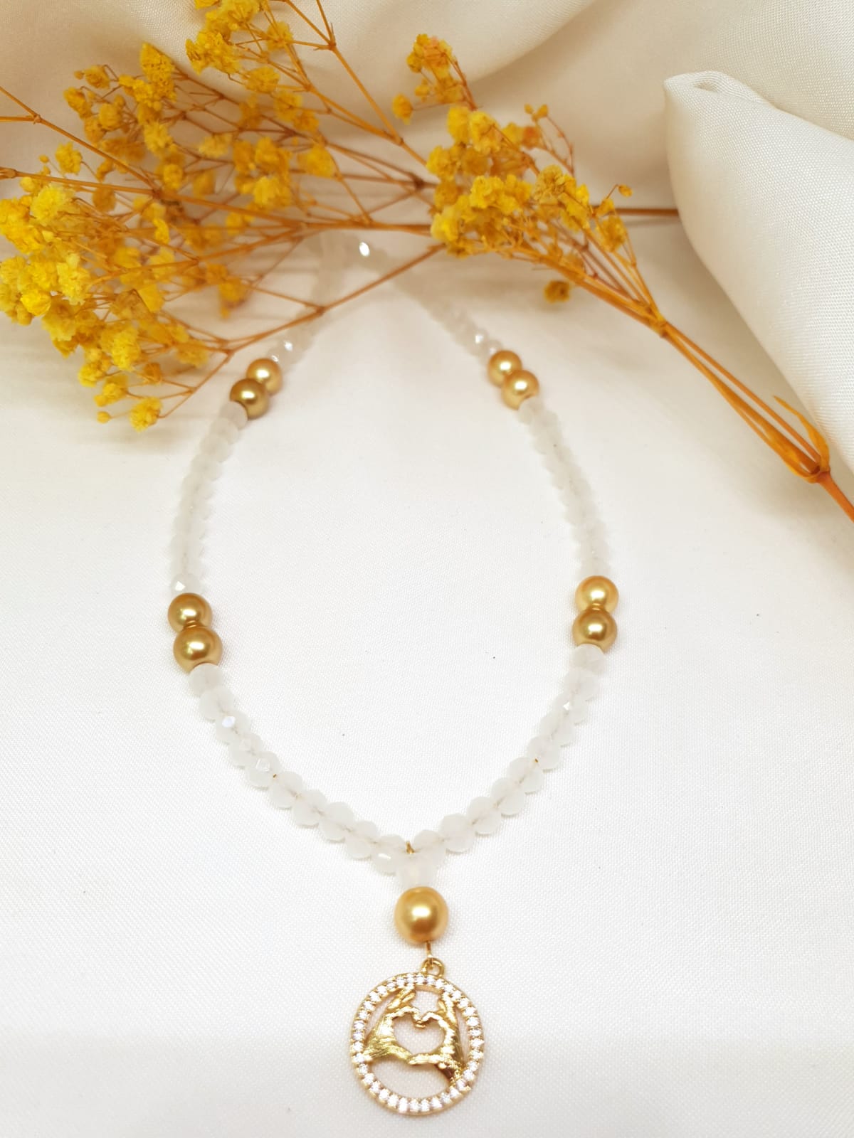 השרשרת הזו מציגה עיצוב מהמם שמשלב בין קלאסיות לאלגנטיות עם נגיעה של רגש. הקריסטלים הלבנים, שמנצנצים בצורה רכה ונעימה, משתלבים בצורה מושלמת עם החרוזים הדמוי פנינה בגוון זהב, מה שיוצר שילוב מושלם של יוקרה ותחכום. הקווים הנקיים והברק המיוחד של הקריסטלים והפנינים מעניקים לשרשרת מראה אלגנטי ומרשים. בקצה השרשרת תלוי תליון "יד לב" בעיצוב מוקפד. התליון, בעיצובו המיוחד והמסקרן, מעניק לתכשיט מגע של רגש ותחושת חום, ומבטא מסר של אהבה והגנה