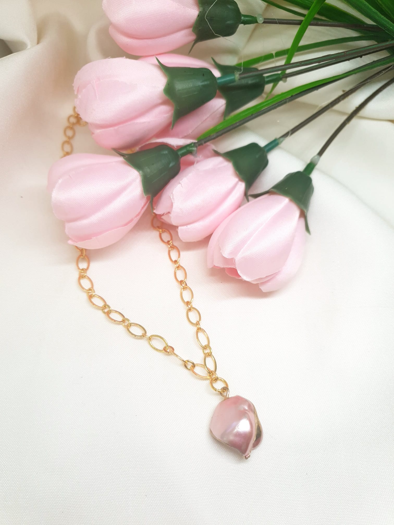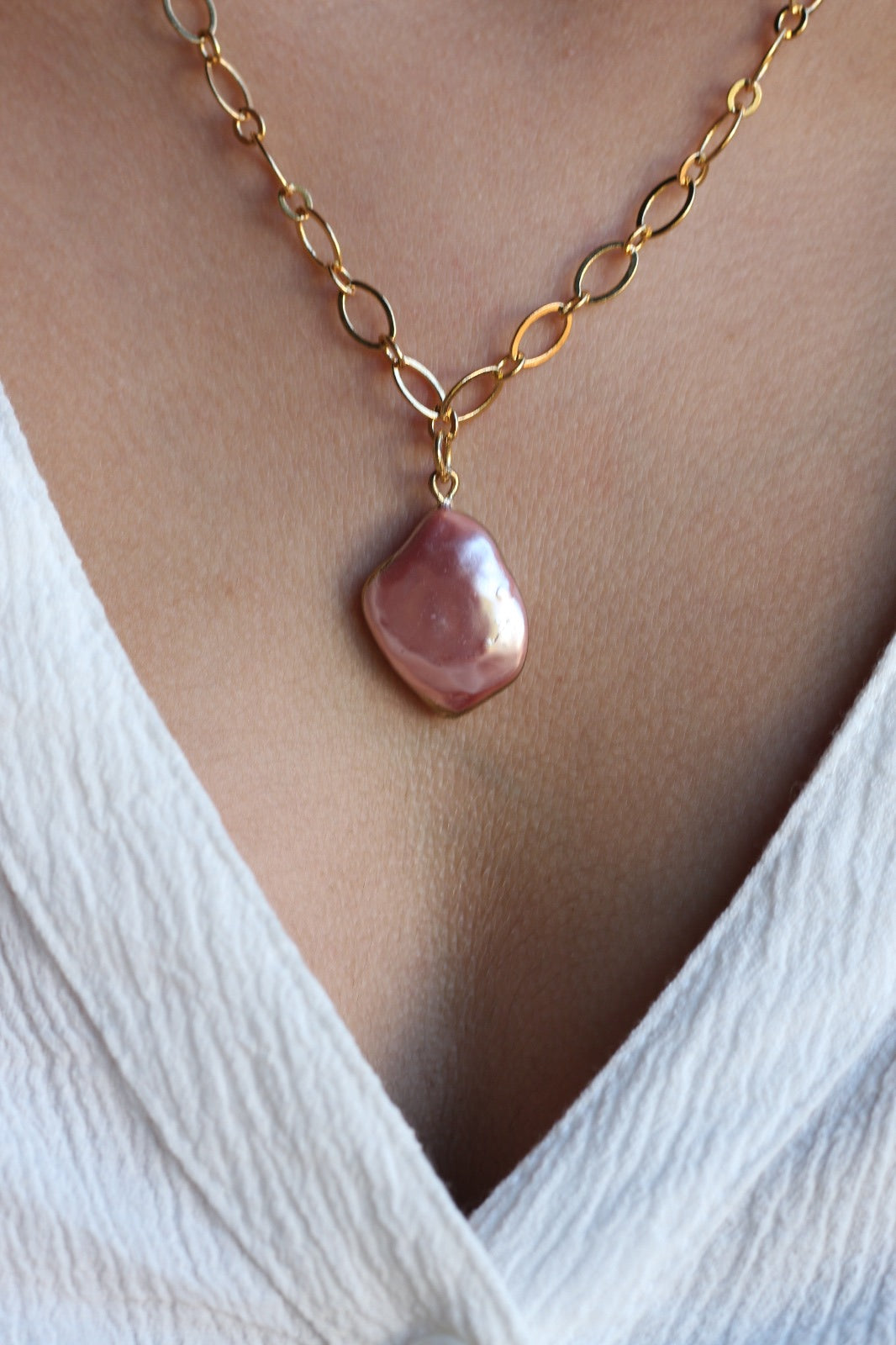 שרשרת אלגנטית ועדינה, עם תליון פנינה אמיתית בצבע ורוד רך ומלטף. הפנינה תלויה על שרשרת מצופה זהב, המעניקה לתכשיט מראה יוקרתי ומעודן. הציפוי הזהוב מדגיש את הזוהר הטבעי של הפנינה ומוסיף להמגע של אלגנטיות מתוחכמת. תכשיט זה מתאים לכל אירוע, בין אם הוא יומיומי או מיוחד, ומהווה תוספת קלאסית