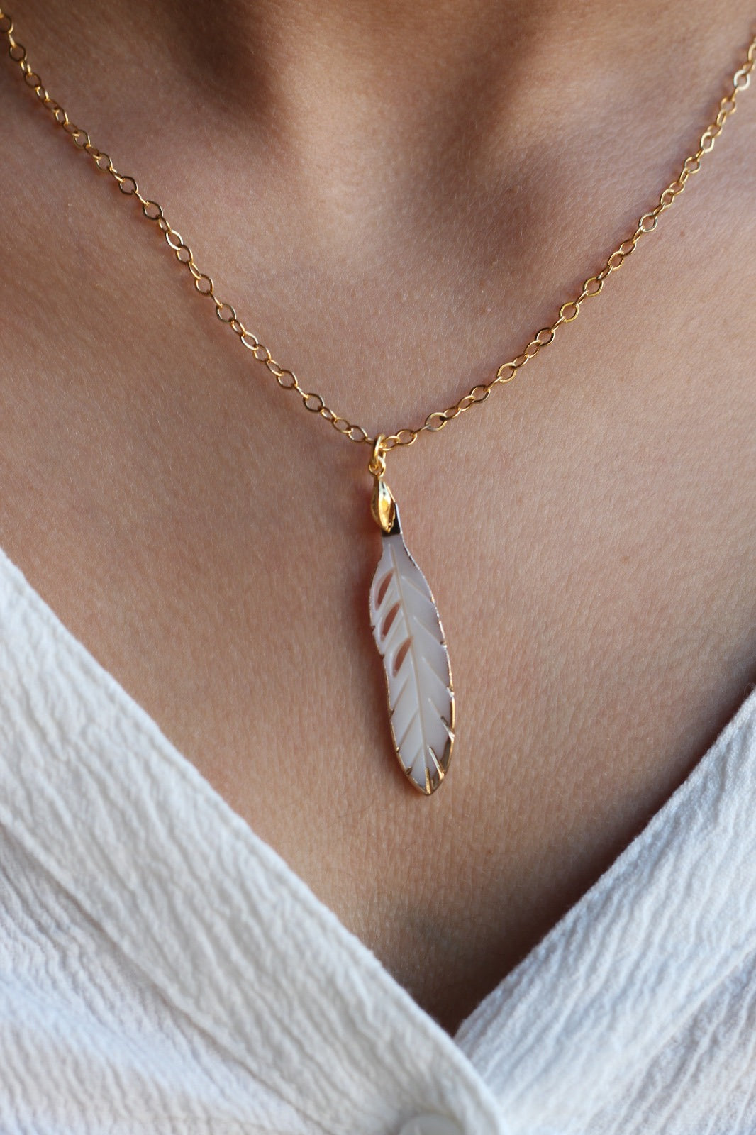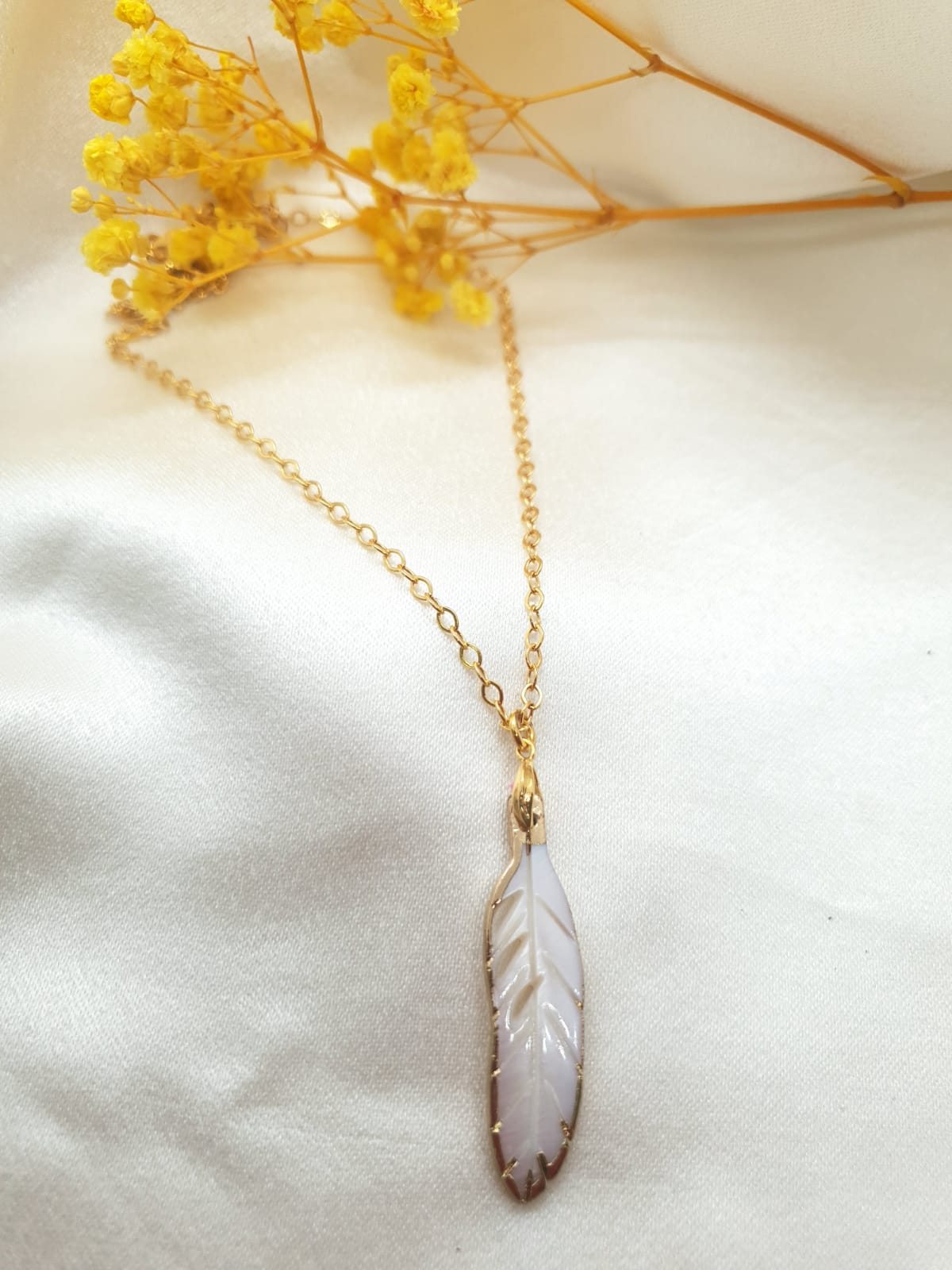 תליון עדין בצורת נוצה, עם קווים חרוטים המדמים את מבנה הנוצה הטבעית. התליון מוקף במסגרת בצבע זהב, המשווה לו מראה אלגנטי ונעים לעין. השרשרת הדקה והזהובה משלימה את העיצוב האלגנטי, מה שהופך את התליון לאביזר מושלם לשימוש יום-יומי או לאירועים מיוחדים. התכשיט משתלב בקלות עם מגוון סגנונות אופנה